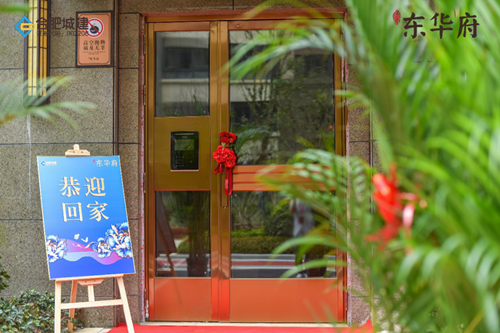 在交房现场,无论是“恭迎回家”的清凉水牌、还是入户门上精心绑就的锦簇花团,一景一物,都以恭迎的姿态,迎接东华府东苑的业主幸福归家。
